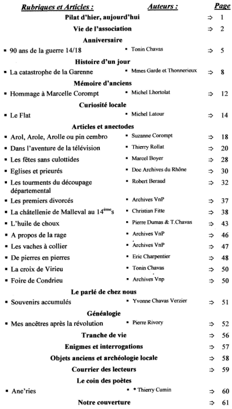 > Pilat d'hier, aujourd 'hui, Pélussin > Souscription en faveur de la construction d'un chemin de fer > Collision de Pavezin, 14 juin 1912 > Fenils, gerbiers, abots, paillères, qu'êtes vous devenus ? > L'annuaire du téléphone 1930 > Le calendrier républicain > La maison de Mémée > La maison apparemment sans histoire > Solencenas > Le bâton du Maréchal de Villars > Notice sur Alléon Dulac > Le Rhône, vieux paysages > St-Pierre-de-Bœuf anecdotique > Garce ! > Règlement 1903 de l'union des joueurs de boules > Pierre Bonnardel, curé de Condrieu, prêtre réfractaire > Le diable et le curé > Les petits loups > Forêt du Pilat > Le vin > Procès d'eau > Les cloutiers > Rapport de police > Mémoire > Un incendie à Malleval > Fonctionnement des gardes civils du canton > Le palais de la jeunesse. Saint Sabin > Fondation de l'église de Graix > Les curés pendant la révolution > Le Pilat, un terreau de pionniers > L'an mille neuf cent cinq (poème) |